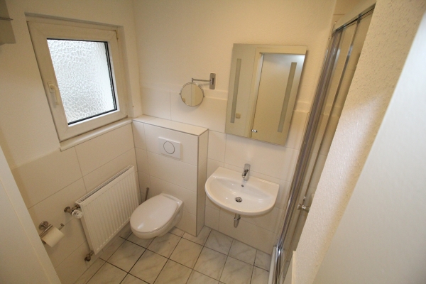 Das Duschbad mit Fenster ist mit einer großen Dusche, Waschbecken, WC und Fön ausgestattet.